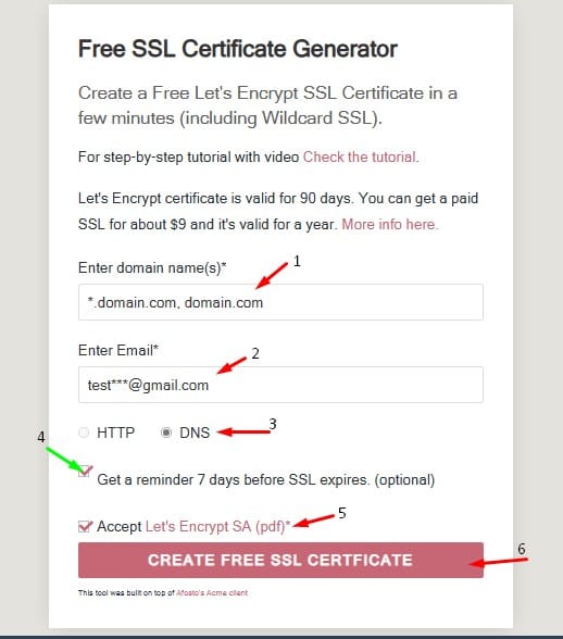 https://punchsalad.com/ssl-certificate-generator/ linkine gidin ve aşağıdaki görseldeki gibi domain ve email bilgilerinizi forma girin.