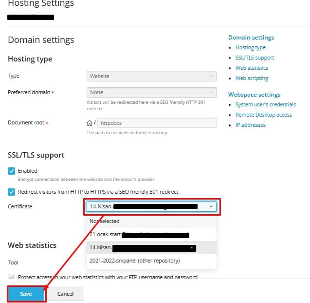 Hosting Setting bölümü açıldıktan sonra. Certificate bölümünden yeni eklediğiniz sertifikayı seçip kayıt ediyoruz.