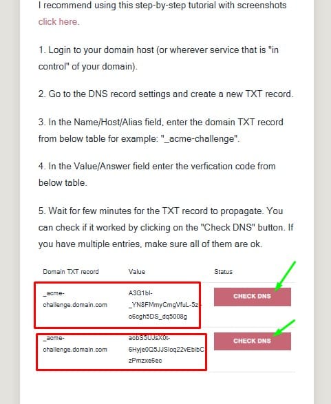 Her iki (Check DNS) butona da ayrı ayrı basarak “DNS Record OK” mesajını aldıktan sonra alttaki “Verify Domain” butonuna tıklayarak devam edin.