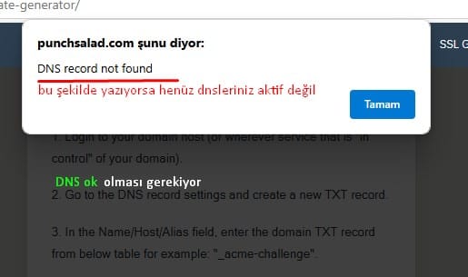Site/domain doğrulaması için sayfadaki “Check DNS” butonlarına tıklayın. Eğer yeteri kadar beklediyseniz Punchsalad.com says DNS Record OK” mesajını almanız gerekiyor. (Beklemediyseniz hata mesajı alırsınız.)