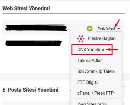 Öncelikle Natro hesabınıza giriş yapın. SSL sertifikasını hangi domain’e kuracaksanız, o domain’in satırında yer alan “Web Sitesi” butonuna tıklayın. Açılan menüden “DNS Yönetimi” seçeneğini seçerek devam edin.