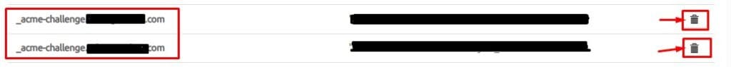 Bu alanda daha önce oluşturulmuş bazı TXT kayıtlarıyla karşılaşabilirsiniz. Eğer benim gibi Let’s Encrypt sertifikanızı 3 ay önce kurduysanız ve doğrulama sonrası eski kayıtları silmediyseniz, burada iki adet _acme-challenge kaydının hâlâ durduğunu göreceksiniz. Yeni doğrulama için bu kayıtların güncel versiyonlarını ekleyeceğimizden, eski olanları karşılarındaki silme butonlarına tıklayarak kaldırın. Diğer TXT kayıtlarını ise olduğu gibi bırakabilirsiniz.