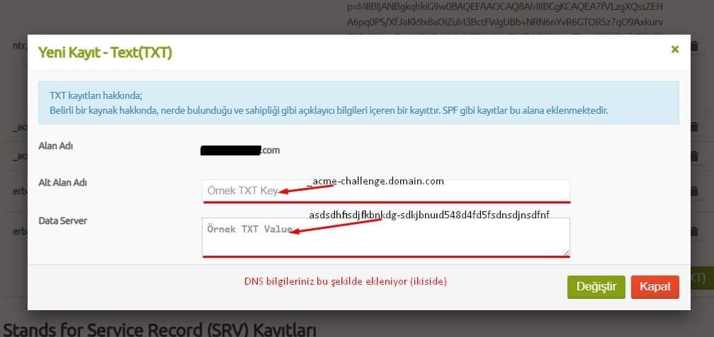 Sonrasında sağ alltaki “Yeni Kayıt (TXT)” butonuna tıklayın. Resimdeki gibi yeni kayıt girme penceresi açılacaktır. Burayı doldurmak için, daha önce açık bıraktığımız sekmedeki (Domain TXT ve Value olan kısım) SSL DNS bilgilerini kullanacağız. Burada 2 kayıt ekleyeceğiz.