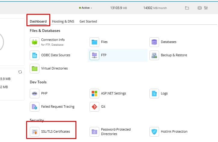 Açılan “Dashboard” sayfasında aşağıdaki Security başlığı altında SSL/TLS Certificates tıklayın. Burada varsa daha önce oluşturduysanız sertifikaları görürsünüz.