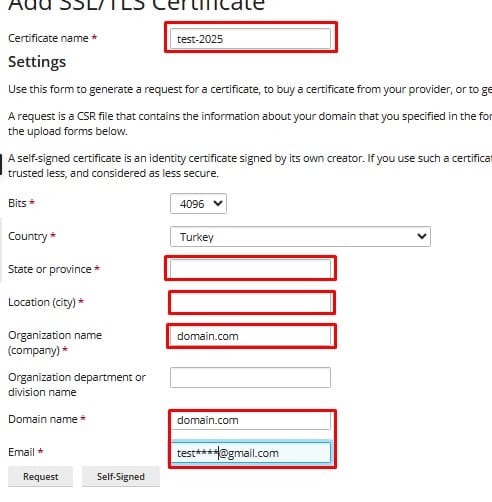 Burada açılan sayfada resimdeki gibi gerekli bilgileri (Serifika adı, domain, mail vs) yazın.