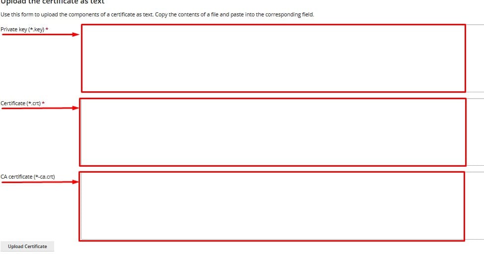 Yapıştırdığımız texte baktığımızda iki adet “Begin Cetificate”-”End Certificate” bloğundan oluştuğunu göreceksiniz. En alttaki “Begin Certificate” bloğunun tamamını başlık ve son satırı dahil olarak buradan kesip, hemen altındaki “CA certificate (*-ca.crt)” alanına yapıştıralım.